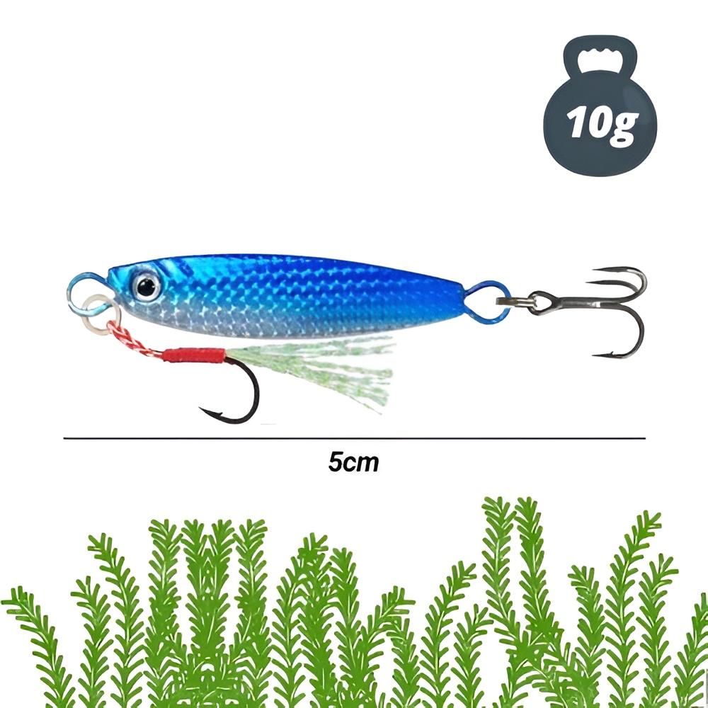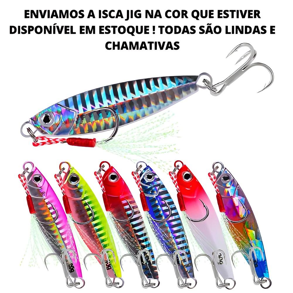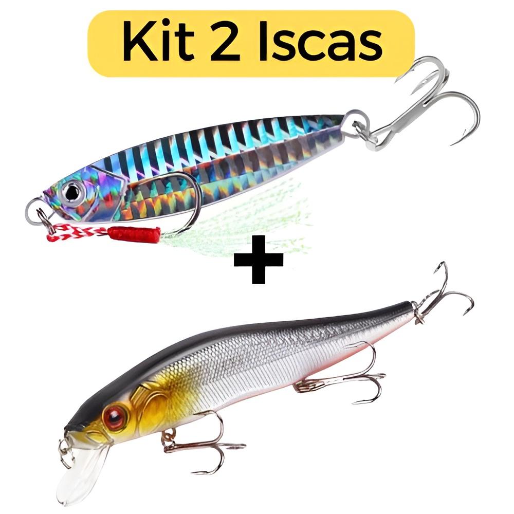 Kit com 2 iscas artificiais ideais para pesca esportiva, combinando um modelo Jig metálico e uma Isca de meia água, proporcionando versatilidade para diferentes técnicas e espécies predadoras.