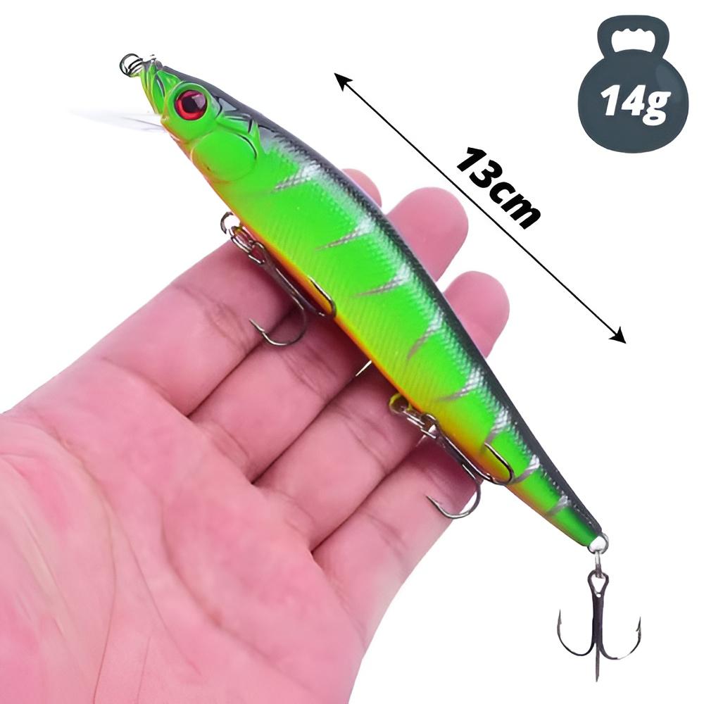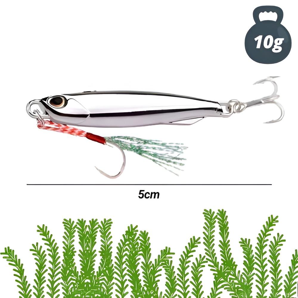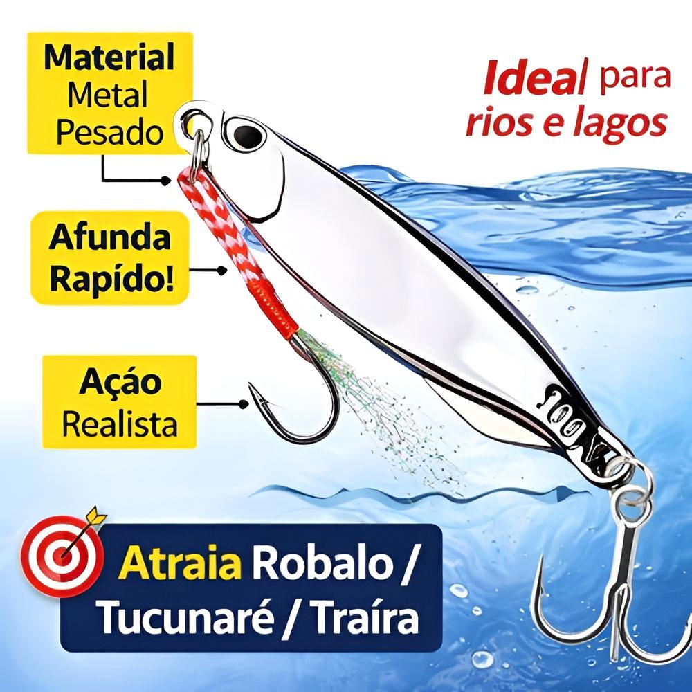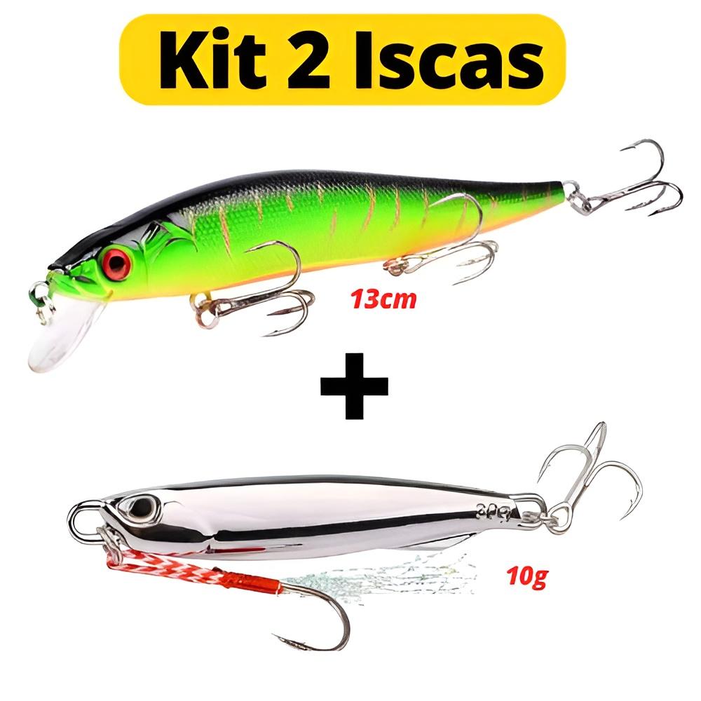 Kit com 2 iscas artificiais ideais para pesca esportiva, combinando um modelo Jig metálico e uma Isca de meia água, proporcionando versatilidade para diferentes técnicas e espécies predadoras.
